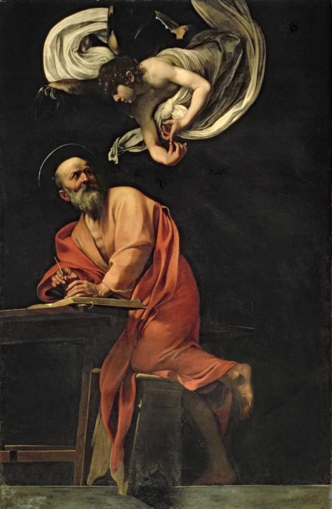 One of his first paintings to be displayed to the public was The Martyrdom of St. Matthew (1599-1600), which demonstrated a highly emotional response to the Biblical text. By the time of The Inspiration of St. Matthew (1602), he was using little tricks to draw the viewer into the painting such as one leg of a stool hanging off the edge of a solid floor at the bottom of the image. He similarly invades the viewer’s space in Christ at Emmaus (1601) with a plate of food protruding over the edge of the meal table on the side nearest to us.