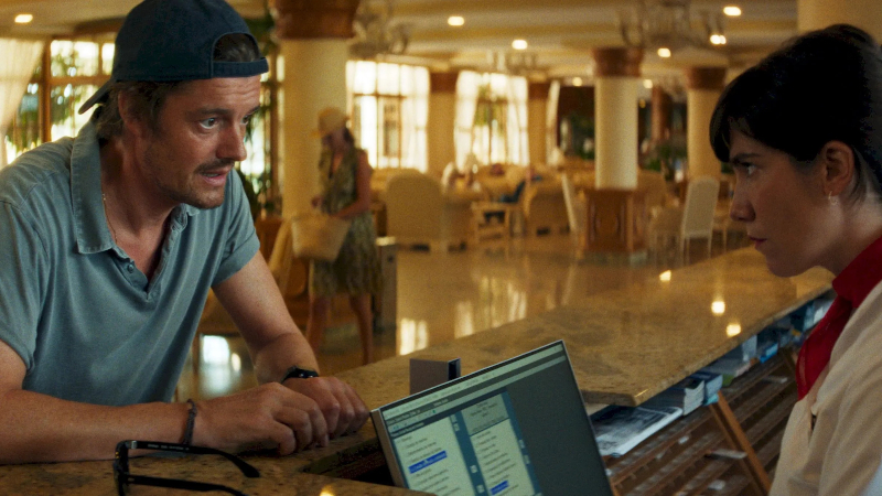Talking to the couple later, he learns that they’re in an unsatisfactory room with a view of the rubbish bins that are noisily collected at 7am in the morning. Off his own bat, he arranges through Maria the desk clerk (Bruna Cusi from Summer 1993, Carla Simón, 2017) to get their room switched for a better one. Suddenly he’s their friend, and gets invited over for the evening. Anne is tired and goes to bed, so Dave gets Tom to take him out to the local night spot. Tom loses track of him at the Waikiki, and goes home.