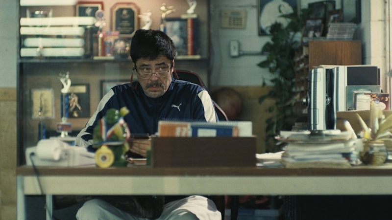 Bob is less lucky: years of substance abuse during his quiet Baktan Cross years have addled his brain. When he gets to a payphone and goes through his half of the complex, pre-written question and answer session designed to protect the French 75, he can’t remember the answer to the line, “What time is it?” Even though, his and his daughter’s life may depend on this. Instead, he seeks help from Willa’s karate sensei Sergio (Benicio Del Toro) who runs an immigrant escape route. Following designated men of Sergio’s across rooftops, Bob fails to keep up and is captured by Lockjaw’s forces…