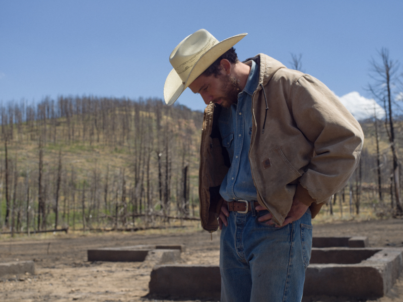 The fire has destroyed the 20 acres of property on the edge of the forest where Dusty (Josh O’Connor from The History of Sound, Oliver Hermanus, 2025; Mothering Sunday, Eva Husson, 2017; God’s Own Country, Francis Lee, 2017) lives, an area of outstanding natural beauty. He sells off his surviving livestock at an auction, then calls in on his ex-wife Ruby (Meghann Fahy from The White Lotus, TV series, 2022) who lives in the nearby town with their pre-teen daughter Callie-Rose (Lily LaTorre) and his mother-in-law Bess (Amy Madigan from Weapons, Zach Cregger, 2025; Pollock, Ed Harris, 2000; Field of Dreams, Phil Alden Robinson, 1989). About to move into one of the units in a trailer park provided by FEMA (Federal Emergency Management Agency), he finds himself unexpectedly and against his initial wishes saddled with the little girl for the next few days.