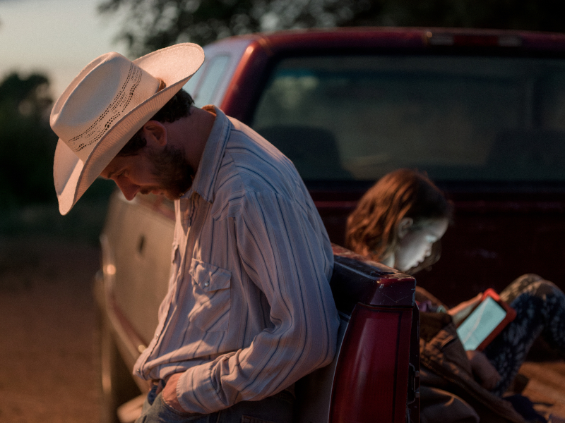 The beautifully understated narrative delivers striking moments couched in ordinary, everyday experience. For instance, during a later visit of Ruby and Callie-Rose to Dusty’s trailer, the young girl gets them putting glow in the dark stars on the interior trailer walls, leading to a near-transcendent moment when they turn out the lights and marvel at the luminous green-glowing glowing stars on the walls around them. This finds an echo in a much later sequence, in daylight sunshine, when Dusty enlists Callie-Rose’s help in painting his trailer blue. In both cases, there’s the feeling of both the power of transformation of a home and a job well done.