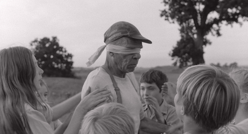There’s a certain fascination with watching Karl’s activities along the lines of, what exactly is he doing now? (as you try to work it out) or, what’s he going to do next? This element provides the film with some of its momentum. His comings and goings are to some extent echoed by the local children, with whom he plays ritual games such as Blind Man’s Buff. While he determinedly builds his fortress, the children are inspired to build one of their own in the forest, using twigs, bits of wood and anything else they can scavenge, a starting point much like Karl’s. Yet, for them, it’s a group pastime, in which they eventually lose interest.