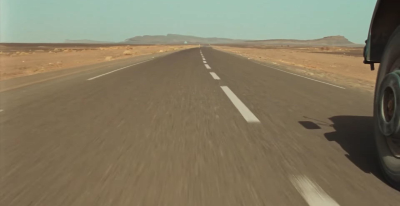 Filmed using real vehicles crossing a real desert, this is also a landscape movie, with many of its landscape vistas breathtaking. These include one scene in a heavy rainstorm where water dribbles down a vast windscreen obscuring the road ahead, and another where the two huge vehicles are reduced to two tiny pairs of headlights on the screen in the darkness as they traverse one of many perilous mountain roads.