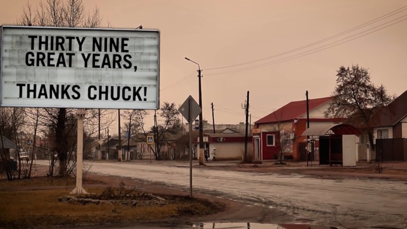 Billboards spring up proclaiming: Charles Krantz 39 Great Years. Thanks Chuck! …and showing a picture of the man (Tom Hiddleston from Loki, TV series, 2016-25; The Night Manager, TV series, 2016-25; Early Man, Nick Park, 2018). TV network transmission cuts out and this same image and slogan cuts in. Later, when it’s dark, as Marty visits Felicia in her residential area, and they stand in the street, the lights in the windows go out as if in a power blackout, only to be replaced soon after with the uncanny glowing image and slogan of the Chuck Krantz billboards. Then the stars start to go out, one by one. Apparently, it’s the end. Of everything.