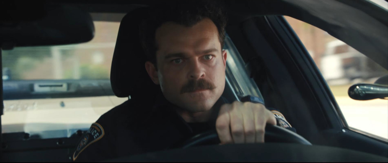 The third section, entitled Paul, shows us something of the cop’s personal life: he is married to Donna (June Diane Raphael), the daughter of his boss the local police chief Ed Locke (Toby Huss), who phones to say her trip is being cut short, so the pair of them can get over to her dad’s do in a few days time, this coming Sunday, so can he let dad know? Out on patrol, Paul spots a young drifter (Austin Abrams) about to break and enter a property, and gives chase in his car, following the young man on foot, catching him, assaulting him, establishing the young man’s name to be James, then realising he left his patrol car’s dash cam on. This queers his pitch with his less-than-impressed father-in-law, but if no-one files a complaint for 30 days, the whole thing will just blow over.