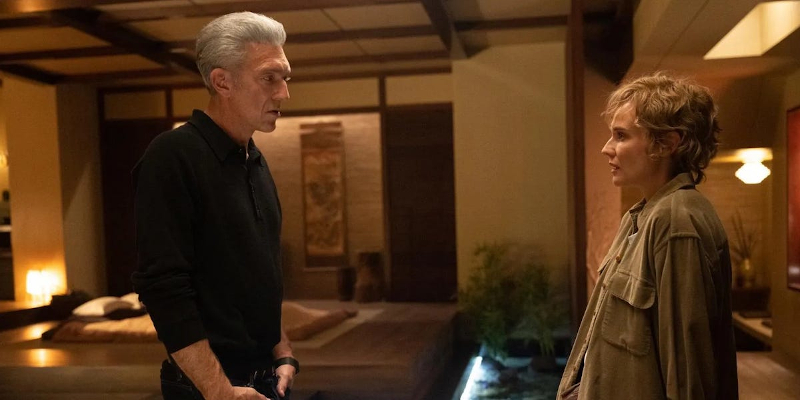 And then, the unthinkable. (Or, at least, the far more unthinkable than the realisation of the concept of Karsh’s GraveTech, which is already some way out there.) Several of the graves and their attendant technology, including that of Karsh’s wife, are vandalised. He learns of this atrocity through the employee who discovered it. That propels the piece away from an exploration of mourning and loss and into conspiracy thriller territory, the sort of filmic architecture that propelled Videodrome (Cronenberg, 1983), although this is nothing like Videodrome. It does, however, likewise contain outside interests (think: Brian O’Blivion, Barry Convex) here reconceived as financially elite types who Karsh sees as potential GraveTech investors. Chief among these is a wealthy Budapest resident whose Korean-born wife Soo-min Szabo (Sandrine Holt from Better Call Saul, TV series, 2022; Once a Thief, John Woo, 1996; Black Robe, Bruce Beresford, 1993) negotiates with Karsh and suggests that her husband might well become an investor in Karsh’s proposed GraveTech Budapest. Before long, she and Karsh are sleeping together.
