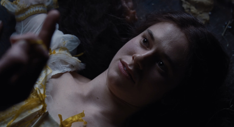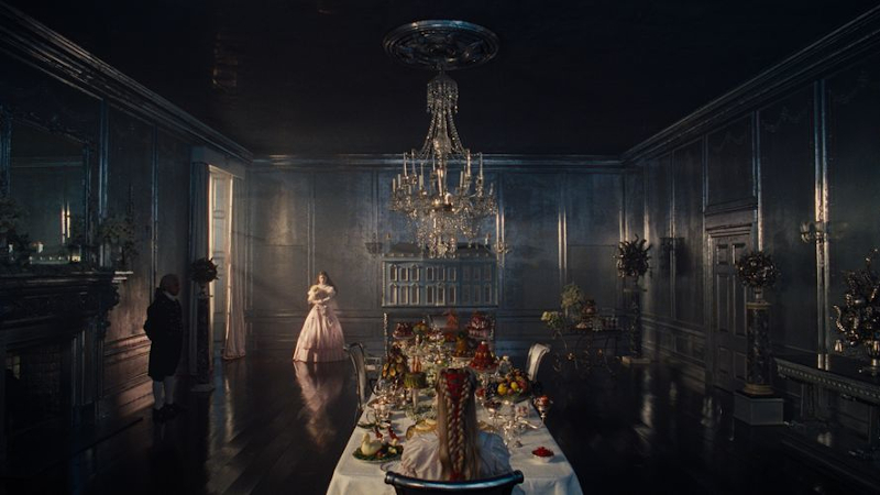 When Cathy and Edgar marry, he gives the house a makeover in her honour; she is given a bedroom with flesh-coloured walls bearing details like veins and moles. It could almost be something out of a David Cronenberg movie, and yet in a way it’s nothing like that. The other rooms in the house are equally distinctive, if not quite as extreme. All this, and equally affecting costumes to match (although there’s no attempt at a flesh suit) convey the feeling not of the naturalism you might expect, but rather of otherworldly fantasy. Clever editing of their life together shows a repetitive and soulless routine, including soulless sex where she is putting up with rather than enjoying it.