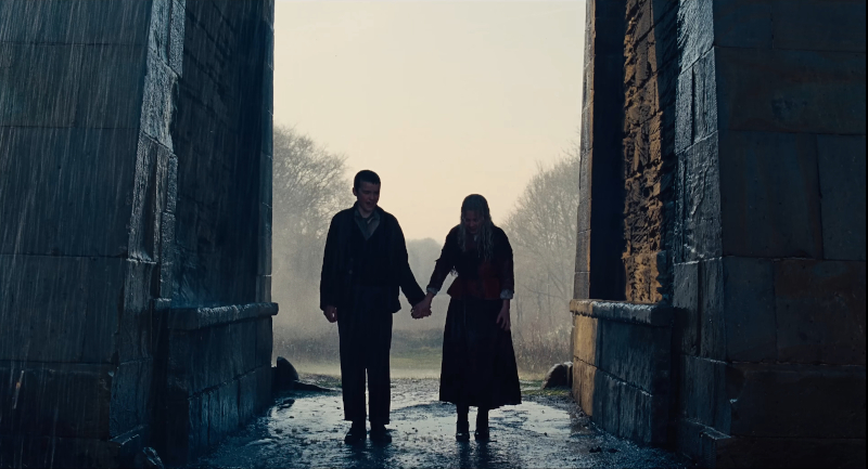 The promise of the opening hanging scene, complete with a disapproving nun, bleak religious slogans and a Punch & Judy show afterwards, echoes the terrifying burlesque of Judy & Punch (Mirrah Foulkes, 2019), yet the rest of the production never quite goes there. Mellington and Cooper, the two kids portraying the two leads for the opening minutes, are terrific. She attempts to teach him to read; he gets discouraged and bails out. (Heathcliff’s illiteracy will come back to bite him later on.)